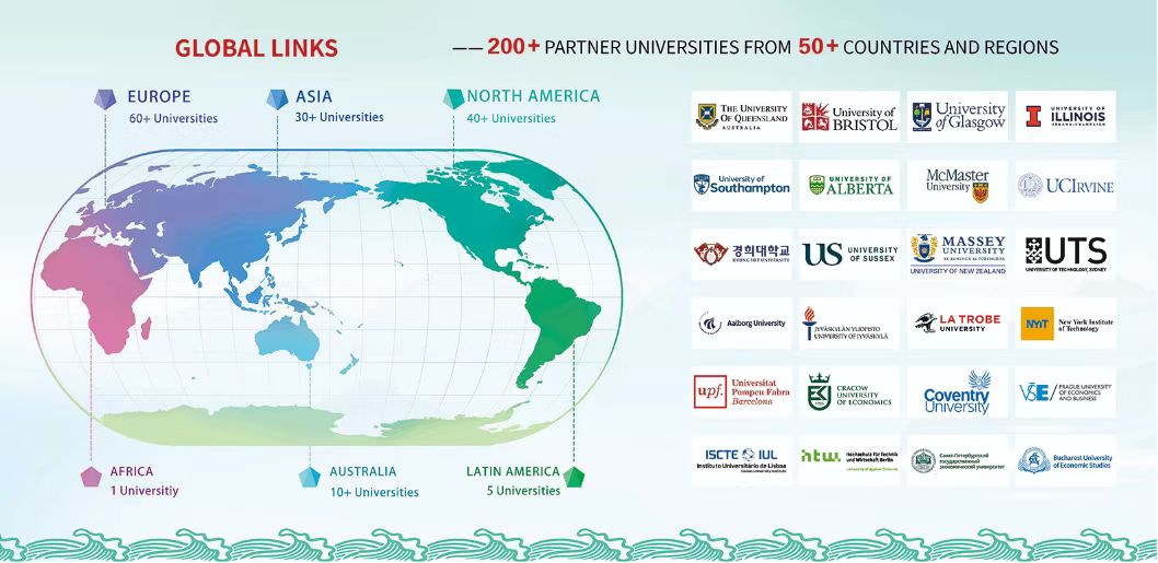 构建全球合作网络,是大学拓展发展空间、整合国际优质资源、服务国家战略需求、提升国际竞争力和影响力的战略基石。我校以服务国家战略、服务地方经济、服务学校中心工作为出发点,按照“扩总量、抓重点、调结构、上层次”的发展思路,围绕“巩固英美、拓展欧亚,深度融入‘一带一路’,优化全球网络布局”的发展策略,坚持“学校主导、学院主体、教授引领”的工作方针,构建了多层次、宽领域、高质量的国际合作网络。目前,已与52个国家和地区的200余所高校建立稳固合作关系,其中28所位居世界QS前300强,覆盖北美、欧洲、亚洲及大洋洲等重点区域。学校先后加入国际商学院联盟、中俄经济类大学联盟、联合国学术影响力组织、国际社会工作教育联盟、中国——东盟旅游教育联盟、欧亚太平洋学术协会、中国—中东欧国家高校联合会、亚太旅游协会和北美案例协会等16个国际组织,并成功设立4个海外教学点,形成“以点带面、全球联动”的合作新态势。这一切,不仅为师生跨境流动搭建了坚实平台,拓展了学校的国际影响力。